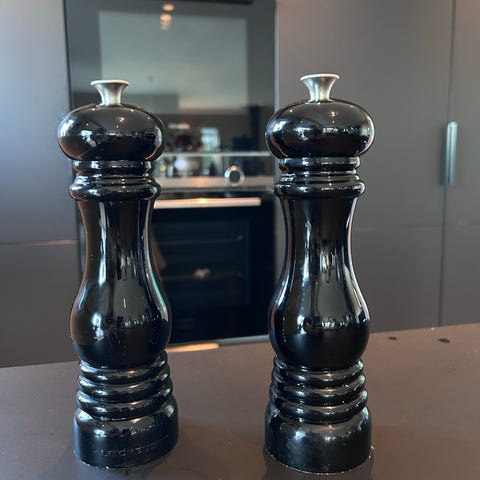 30 cm høye salt og pepperkvern fra Le Creuset, svarte. Selges samlet.