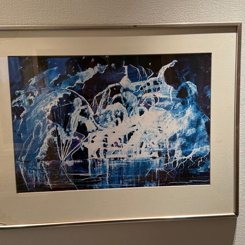 Josef Huz Salgsobjekt kunstverk med unikt design. Innrammet kunstverk med dekorative elementer i ulike materialer og farger.