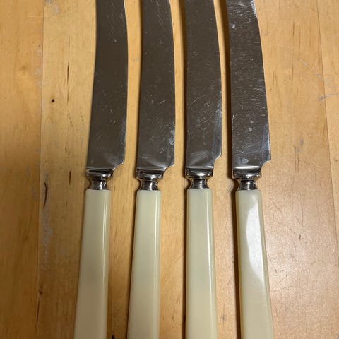 Jeg selger 5 kniver arvet fra min mormor. Hun var født i 1912, så de er nok gamle. Jeg finner ikke noe stempel på dem. De er 18 cm. kr 100 pr stk. Selges samlet for kr 500.