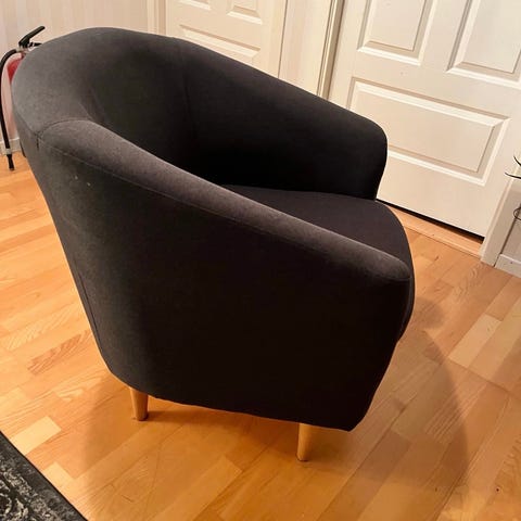 Stolen tar lite plass, men er svært god å sitte i. Passer perfekt i stue, soverom, gjesterom eller kontor. Tidløs farge som er lett å kombinere med annet interiør.