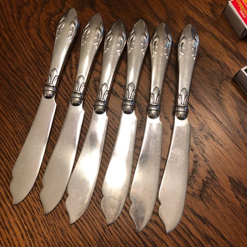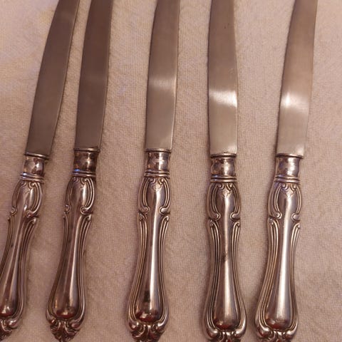 Jeg selger 11 stk. nydelige kniver som jeg har arvet fra min mormor, som var født i 1912, så de er gammel. Jeg finner ikke noe stempel på dem. De har et nydelig mønster. 18 cm. Kr 1100 for alle 11 knivene. 100 kr pr stk.