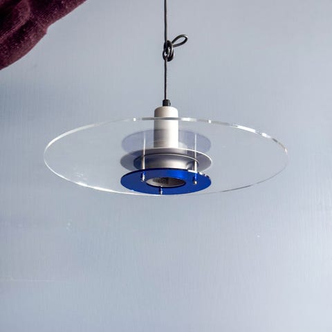 Kraftig metall kombinert med pleksiglass i flere farger. Design Bent Gantzel Boysen. diameter 50cm.