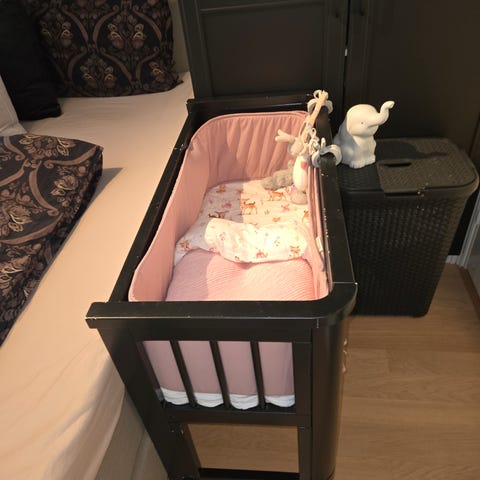 Troll bedside crib med hjul. Madrass inkludert. Kjøpt ny av oss og nesten pent brukt av ett barn.