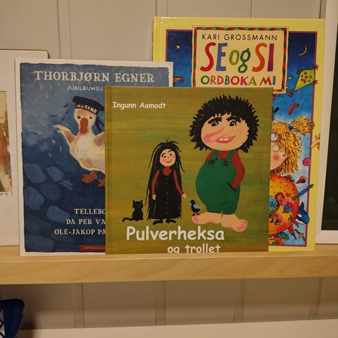 En samling barnebøker med ulike titler og forfattere. Bøkene dekker forskjellige temaer og historier, egnet for barn i ulike aldre. Fra 90-tallet og eldre