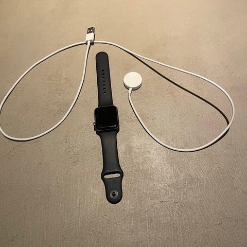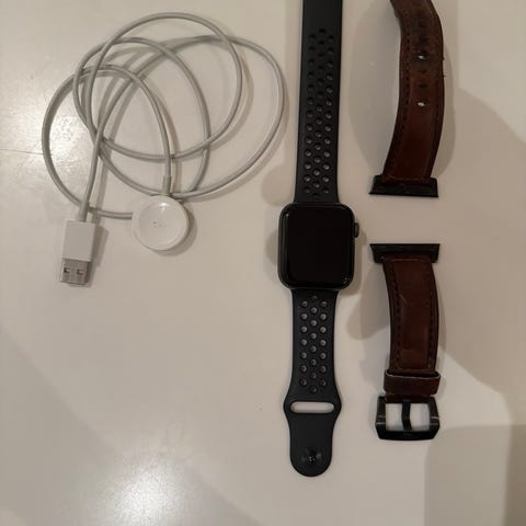 Apple Watch Series 4 smartklokke med beige silikonrem. Inkluderer lader med magnetisk ladeplate.