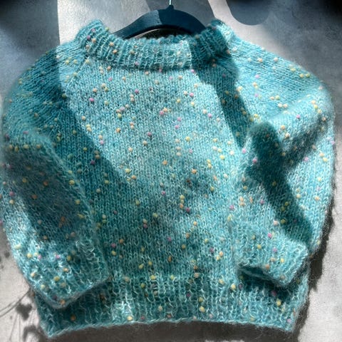 Selger en helt ny hjemmestrikket genser i alpakkaull (myk og stikker ikke) da den dessverre ble for liten.