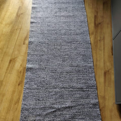 Selger et pent teppe/løper i svartt med mønster. Generelt god stand. Et lite parti med fortykket stoff som kan trolig fjernes med nuppefjerner eller lignende. Se bilde.
