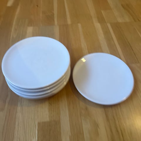 IKEA tallerken sett bestående av flere tallerkener i hvit farge. 5 små og 5 store. En god del riper men ingen sprekker. Må hentes.