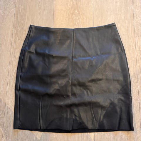 H&M svart skinnimitasjon skjørt i størrelse 40 for dame. Laget av polyester. Skjørtet har glidelås bak og er designet for hverdagsbruk eller mer formelle anledninger.