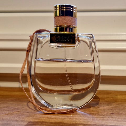 Dolce & Gabbana The One parfyme i glassflaske med gullfarget hette. Produktet vises på et hvitt krus.
