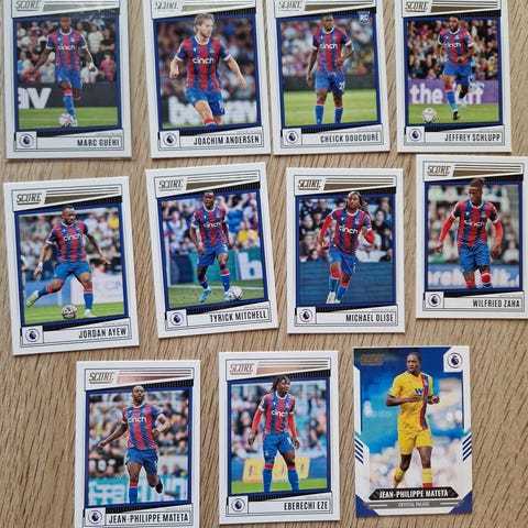 Her kan du velge fotballkort av nye og tidligere Crystal Palace spillere. Kortene er fra ulike serier og årstall. Masse flotte kort av god kvalitet. Kortene er godt oppbevart i sleeves og toploadere. Ingen kort har synlige skader eller slitasje. Kortene fremstår som nye.