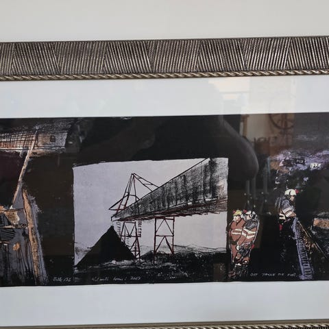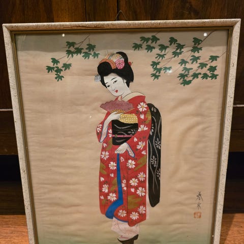 Maleri som viser et rosa tre med detaljerte blader ved vannkanten. Kunstverket har en bakgrunn med myke farger og en signatur nederst. Passer til dekorasjon i hjem eller kontor.