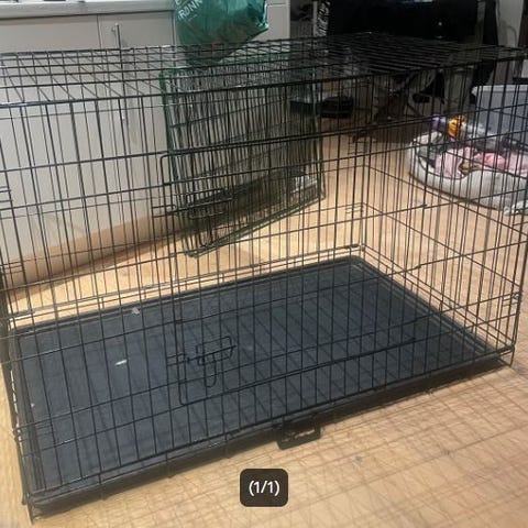 Hundebur laget i grått stoff med nettingvinduer. Buret har åpninger foran og på toppen, og kan brettes sammen for enkel oppbevaring og transport.