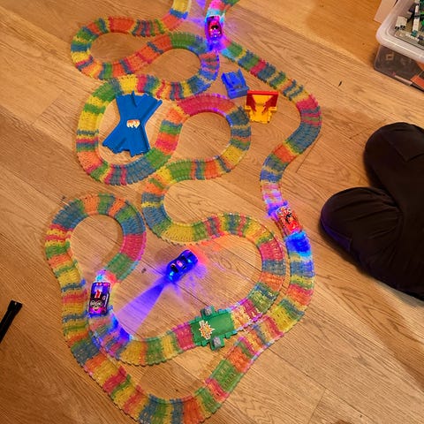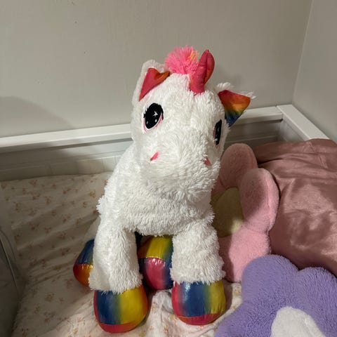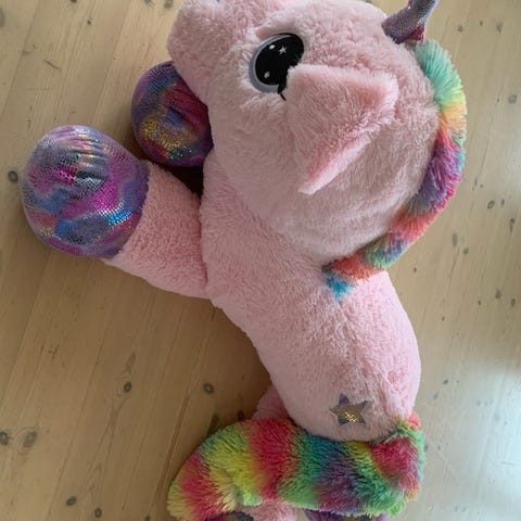 Stor (ca 40 cm) interaktiv enhjørning som forteller tre ulike eventyr. Den beveger munnen, blunker og lyser med hornet. Må hentes I Bergen