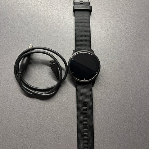 Garmin Venu 2S med mørk grå reim, 40 mm. Enheten har rund urskive og digital skjerm. Egnet for daglig bruk og aktivitetsmåling. Brukt i 2 år (ikke daglig).
