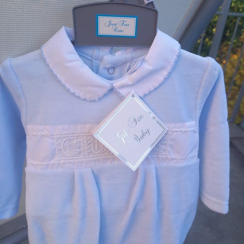 Reflex barneklær i bambusviskose, grønnblå farge, størrelse 56, unisex. Med dinosaurer på. Stoffet er veldig behagelig mot babyhud.