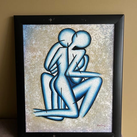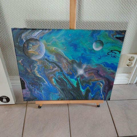 Abstrakt maleri i ramme med en kombinasjon av jordfarger og blåtoner. Maleriet har en firkantet form og er innrammet i en brun ramme. Kr 300