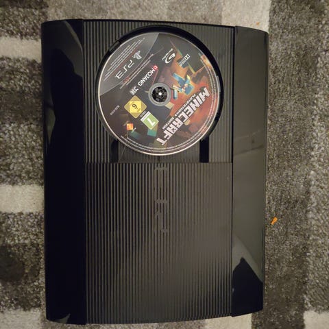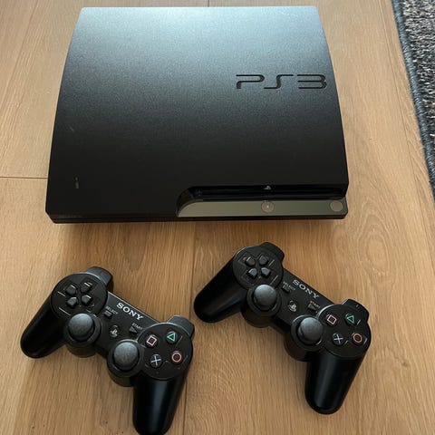 Sony PS3 spillkonsoll i svart farge. En konsoll for videospill med flere tilkoblingsmuligheter og støtte for ulike spillformater.