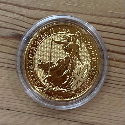 Nydelig 1/10 oz Britannia gullmynt 2023 i kapsel selges.
