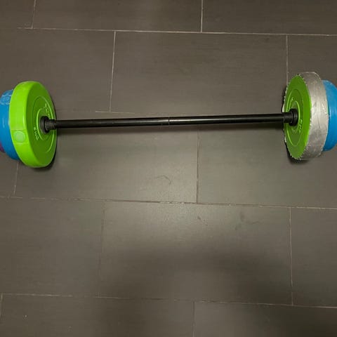 En vektstang med flere fargede vektskiver i oransje, grønn og gul. Stangen er av metall og egnet for styrketrening. Vektskivene har ulik størrelse og farge for enkel identifisering. 5 kg, 2,5kg og 1,5 kg skiver. 2 av hver.