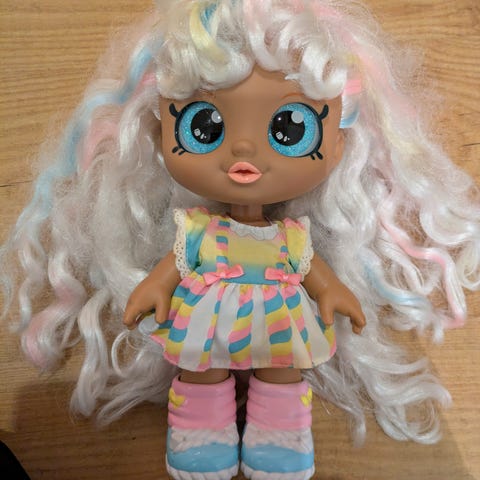 Fin dukke med øyne som «flytter seg» slik at det ser ut som den ser på deg. Litt bustete hår ellers veldig fin.