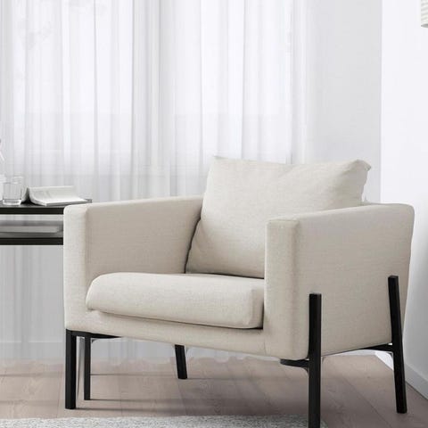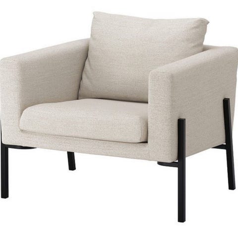 IKEA KOARP lenestol i grått stoff med sorte ben. Moderne design med polstret sete og ryggpute. Må hentes i Bergen.