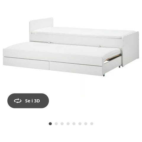 Hvit seng fra IKEA. Perfekt for barnerommet med 2 skuffer til oppbevaring og 1 skuff med ekstra madrass til overnattingsgjester. Har en liten skade på baksiden, men det synes ikke ettersom sengen står inntil vegg.