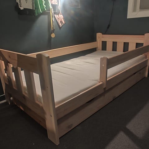 Pent brukt barneseng, kjøpt for 7 måneder siden pent brukt 4 skrue merker av type veldig små ikke synlig😊 må hentes😊 alt følger med skuffe, seng, madrass og trekk
