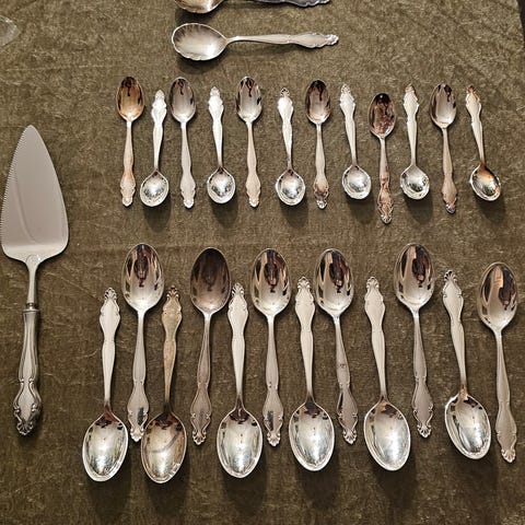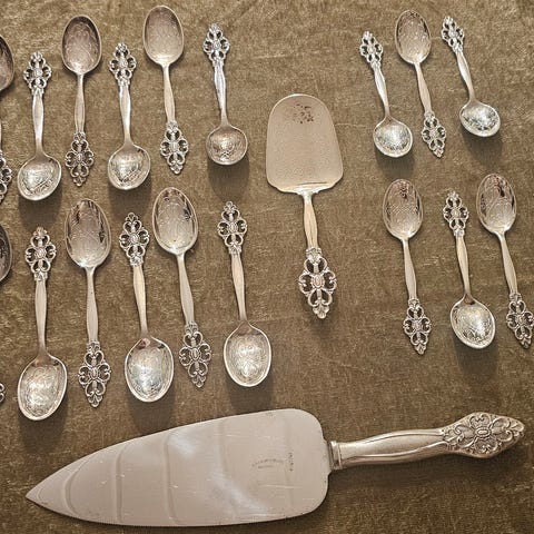 12 stk teskjeer. Kake spade . 2x kompott skjeer. 1 stor serveringsskjee (isskje)