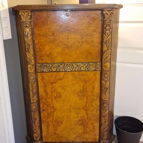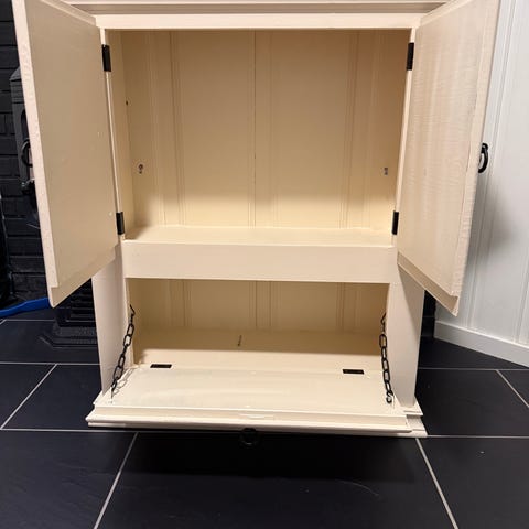 Pent brukt barskap i form av en kano/båt. Skapet er laget plast og slags treverk.