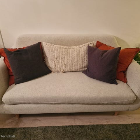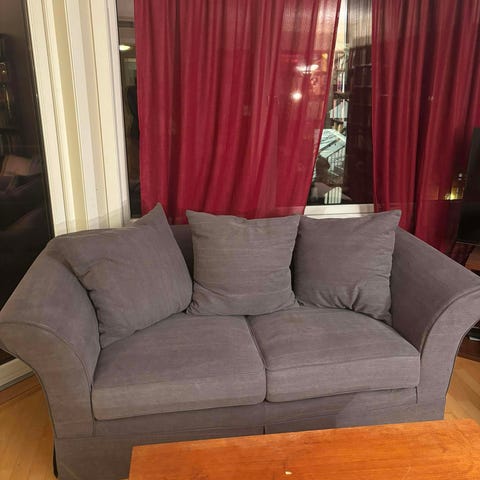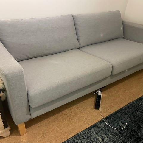 IKEA Karlstad sofa i grått stoff. Sofaen har to seter og rette armlener. Den har en enkel og moderne design med ben i tre. Pent brukt og må hentes i Bergen.