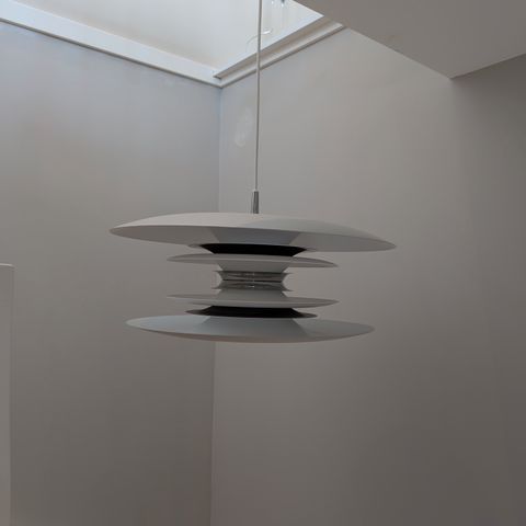 Populær kjøkkenlampe ( fra Belind Varberg i Sverige) 80 tals/tidløs design i hvitt og krom. Ø 43 cm H 20 cm . Metallhåndtak for lett høydejustering, tre skjermer i metall som gir blendefritt lys.