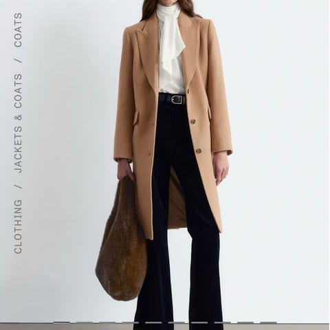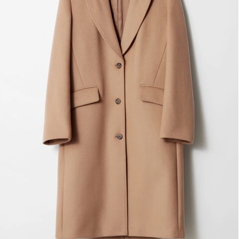 & Other Stories Kåpe i gul farge delvis i ull. Dressjakke stil, med skulderputer. Den har belte i livet for justering.