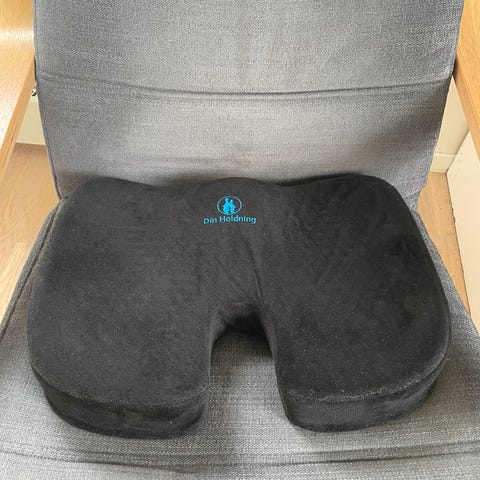 Din Holdning ergonomisk sittepute i svart farge. Putens design gir støtte og komfort ved sitting, egnet for bruk på kontorstol, bilsete eller andre sitteflater. Materialet er mykt og behagelig, tilpasset for å forbedre sittestillingen.
