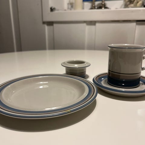 Pent kaffeservice fra Porsgrunn med detaljer i sølv.