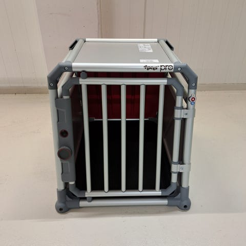 Dette hundeburet er laget av metallramme med plastpaneler. Det har en dør med spiler og mål som vist på bildene. Buret er egnet for transport eller oppbevaring av hunder i liten eller medium størrelse