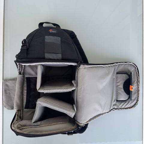Plass til 2 speilreflekskameraer og 3-4 objektiver, blitz og annet tilbehør.