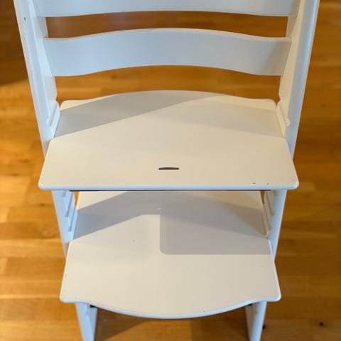 Stokke steps barnestol med avtakbart brett og polstret sete med mønster. Stolen er designet for barn og har sikkerhetssele for trygg bruk.