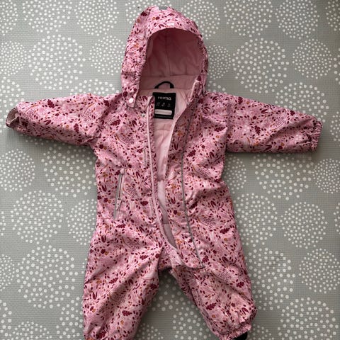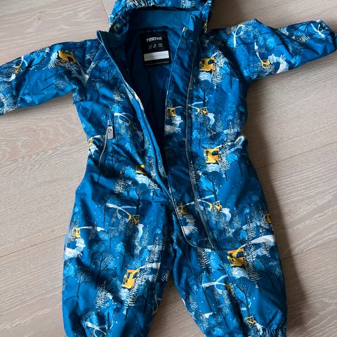 Reima Puhuri vinterdress i størrelse 80 med avtakbar hette og flerfarget design. Svært pent brukt: kun brukt 2 ganger og selges nå fordi min datter har vokst ut av den.