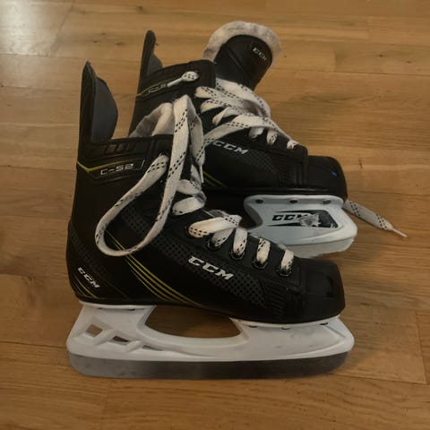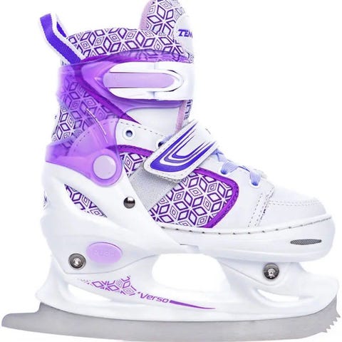 CCM barneskøyte for ishockey, størrelse 32. Skøytene har en kombinasjon av hvit og lilla farge med stjernemønster, og er designet for barn.