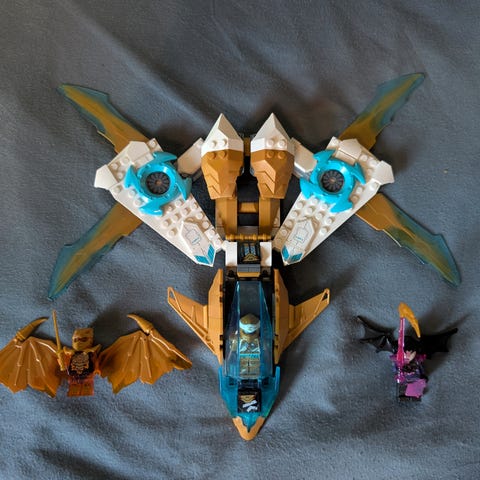 Får med Lloyd hodet med hette på, kai hode med hår, maske til kai, Zane sin hette, kropp med treningsklærne til Lloyd, Zane sit hode og overkroppen med hår, Jay sin kropp, pirat fra sesong Skybound uten hode, Samurai X uten hjelm,