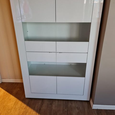 3 glasshyller, skuff nederst, dekorativ list øverst og belysning
