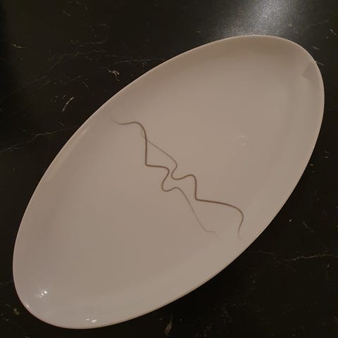 Selger et pent brukt fat som har blitt brukt til interiørstyling. Fatet ble kjøpt på marked av ei som lagde dem selv for noen år tilbake. Passer fint til å servere mat på (obs, aner ingenting om det er godkjent for mat) eller til å ha på stuebordet med lys på.