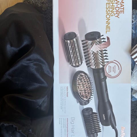 BaByliss Titanium Gold Air Style hårføner med 800W effekt. Inkluderer 3 utskiftbare børster: 20 mm rund børste, 20 mm børste med naturlige børstehår og 40 mm børste med naturlige børstehår. Har 2 temperaturinnstillinger, 2 hastigheter og kaldluftsfunksjon.