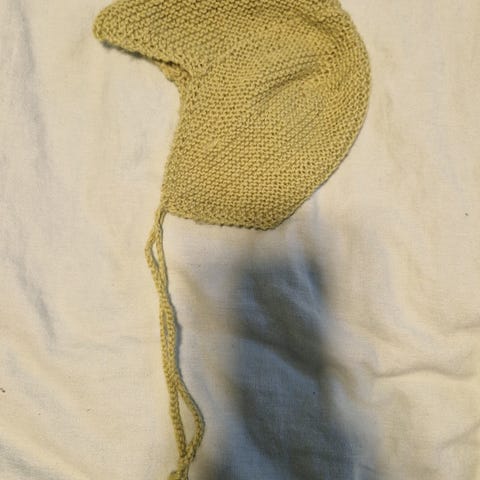 Hjemmestrikket unik lue i merinoull med pyntekant. Måler 16 cm før pyntekanten, er noe tøyelig.