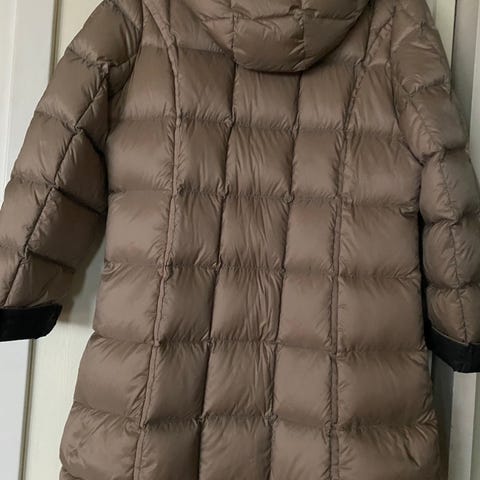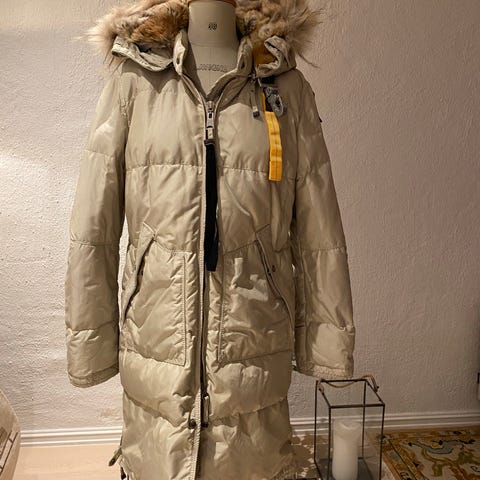Desverre ingen lapp med beskrivelse ang dun mengde men jakken er tykk og god ved prøving er i str s men passer fint en str m ,,