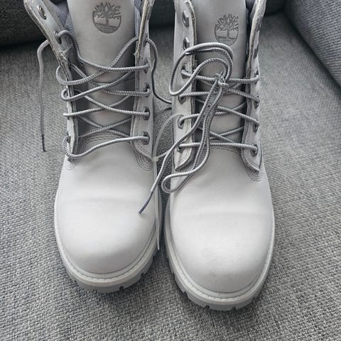 Timberland støvler i skinn i størrelse 36, hvit farge. Støvlene er laget av materiale som gir god slitestyrke og komfort. Med synlige bruksmarker men det har mye ingen.
