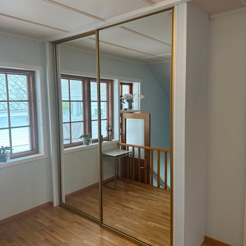 3 stk skyvedører til skyvedørsgarderobe gies bort mot henting. Hver søre er 181cm høy og 112 cm bred. Passer å bruke der det er skråtak og en ikke trenger full høyde. Topp og bunnskinne medfølger.