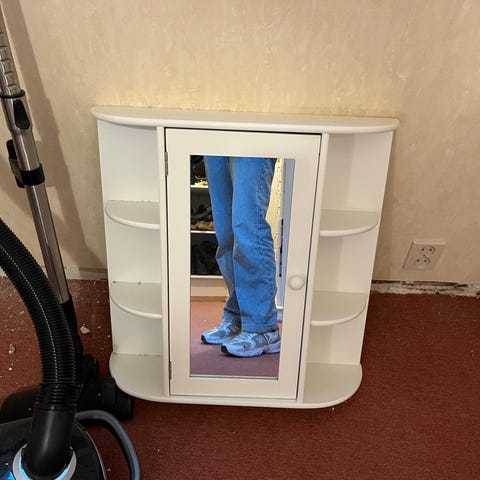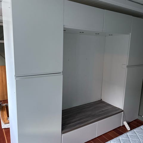 2 dører er hvite med aluminiumsramme og 1 stk er speil.
