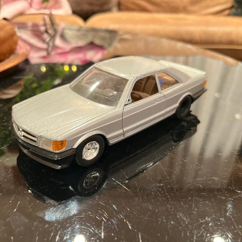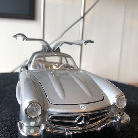 Mercedes-Benz 540K Roadster modellbil i svart og sølv med detaljer som åpningsbar motorhjelm og reservedekk bak. Modellen viser motor og understelldetaljer. Passer som samlerobjekt eller dekorasjon. Skal 1:20 , står godt sammen med biler i 1:18. mangler selve glasset til frontruta, men stolpene finnes kvar, så man kan komplettere med transparent plastikk om ønskelig.